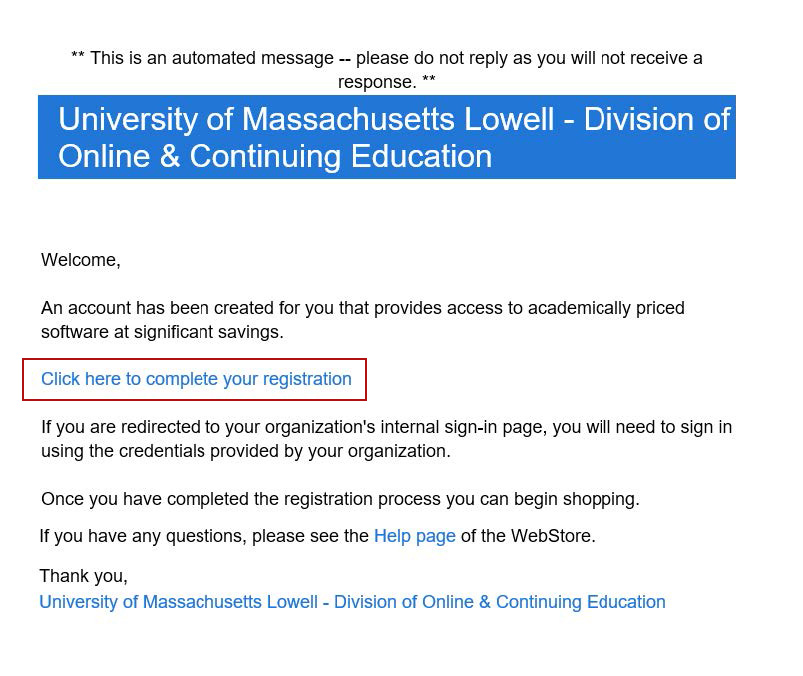 If you received an e-mail like the one shown below, click the link to complete registration (shown here in the red box)